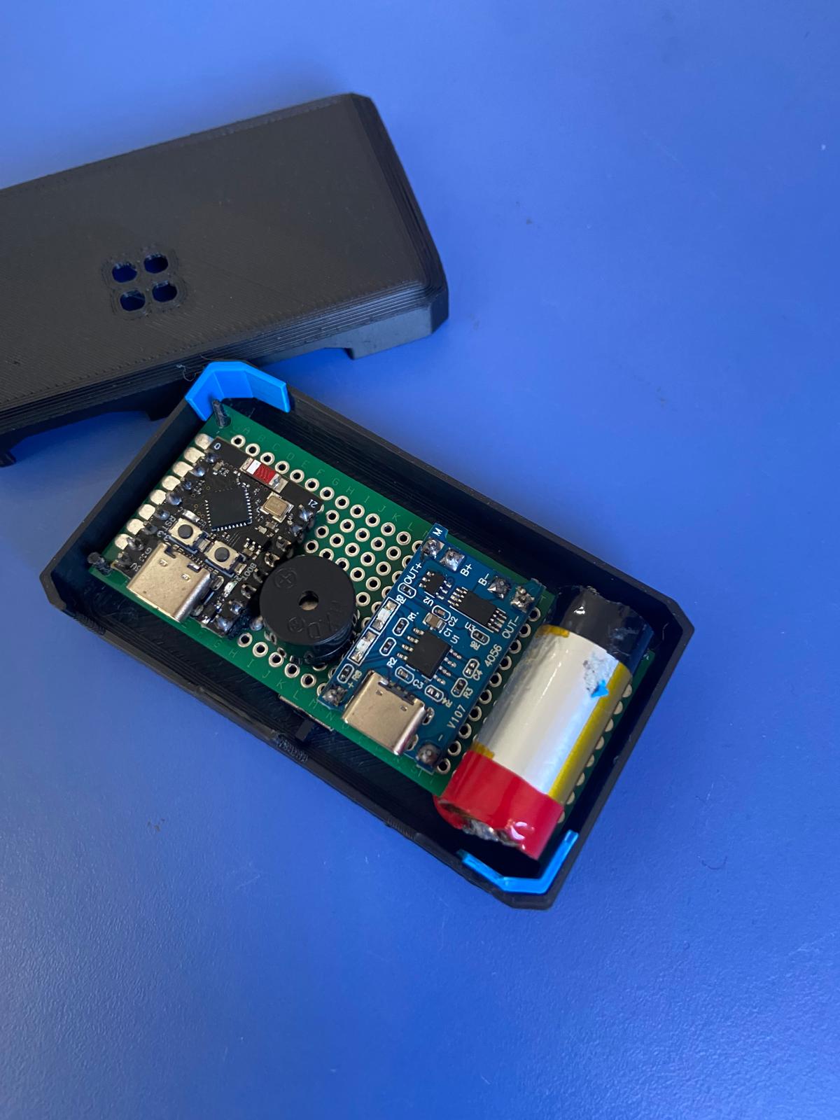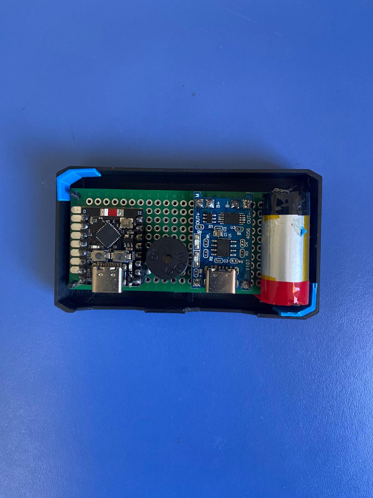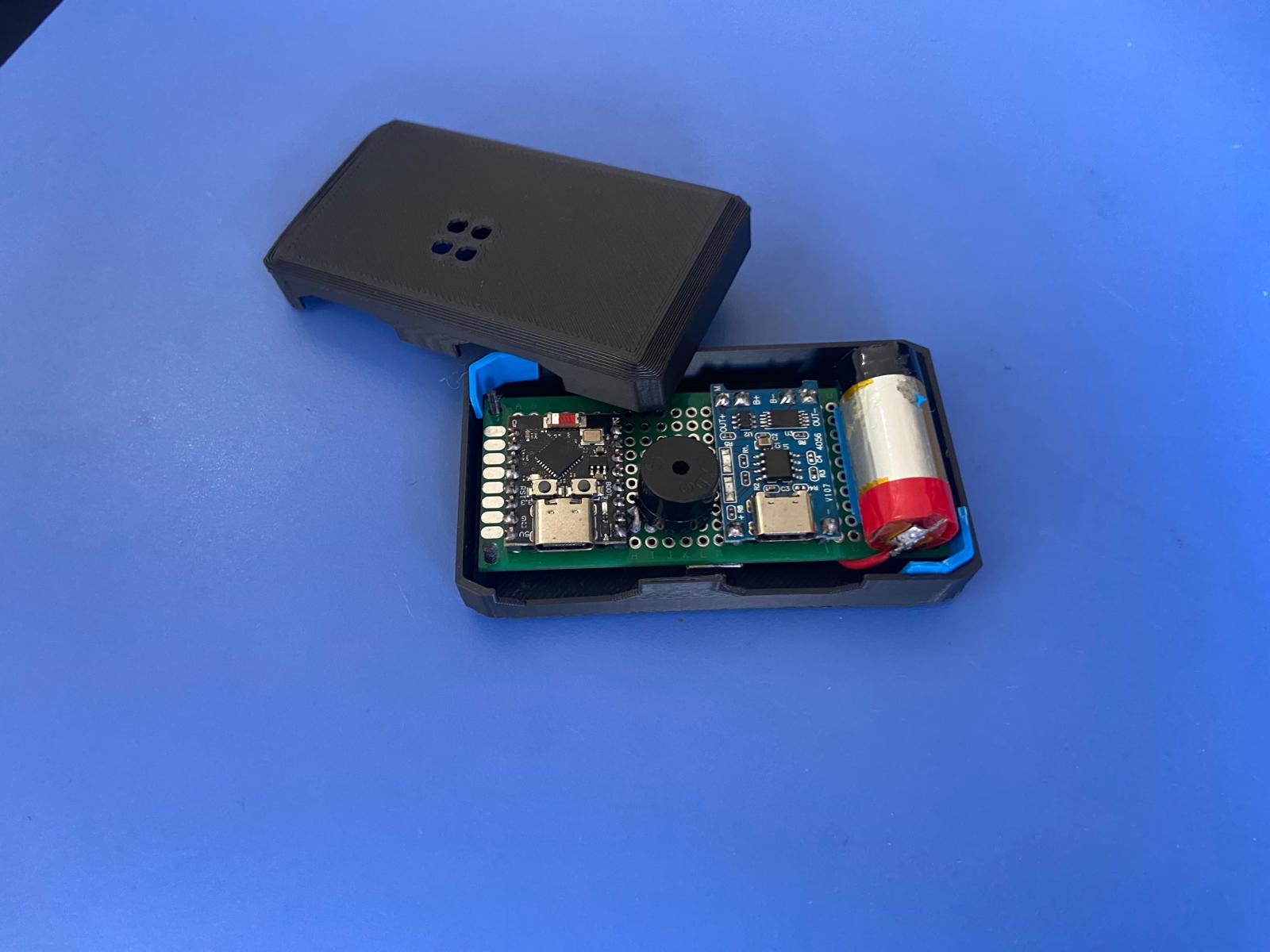 Hello! This is Gelotag, a handmade BLE-enabled tracking device powered by an ESP32. It connects via Bluetooth to your smartphone and allows you to activate a small buzzer remotely, helping you locate whatever it's attached to.